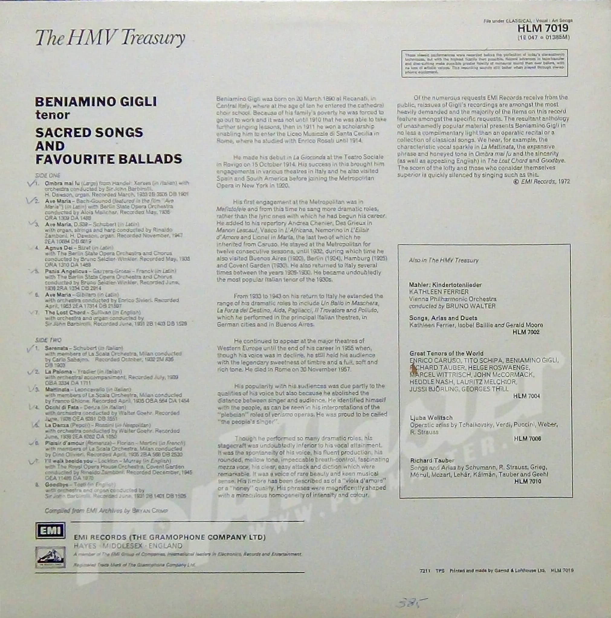 Beniamino Gigli Sacred Songs And Favourite Ballads HLM 7019