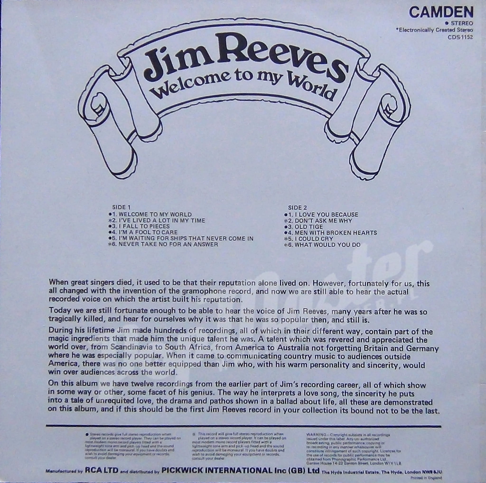 Jim Reeves Welcome To My World CDS 1152 Mint