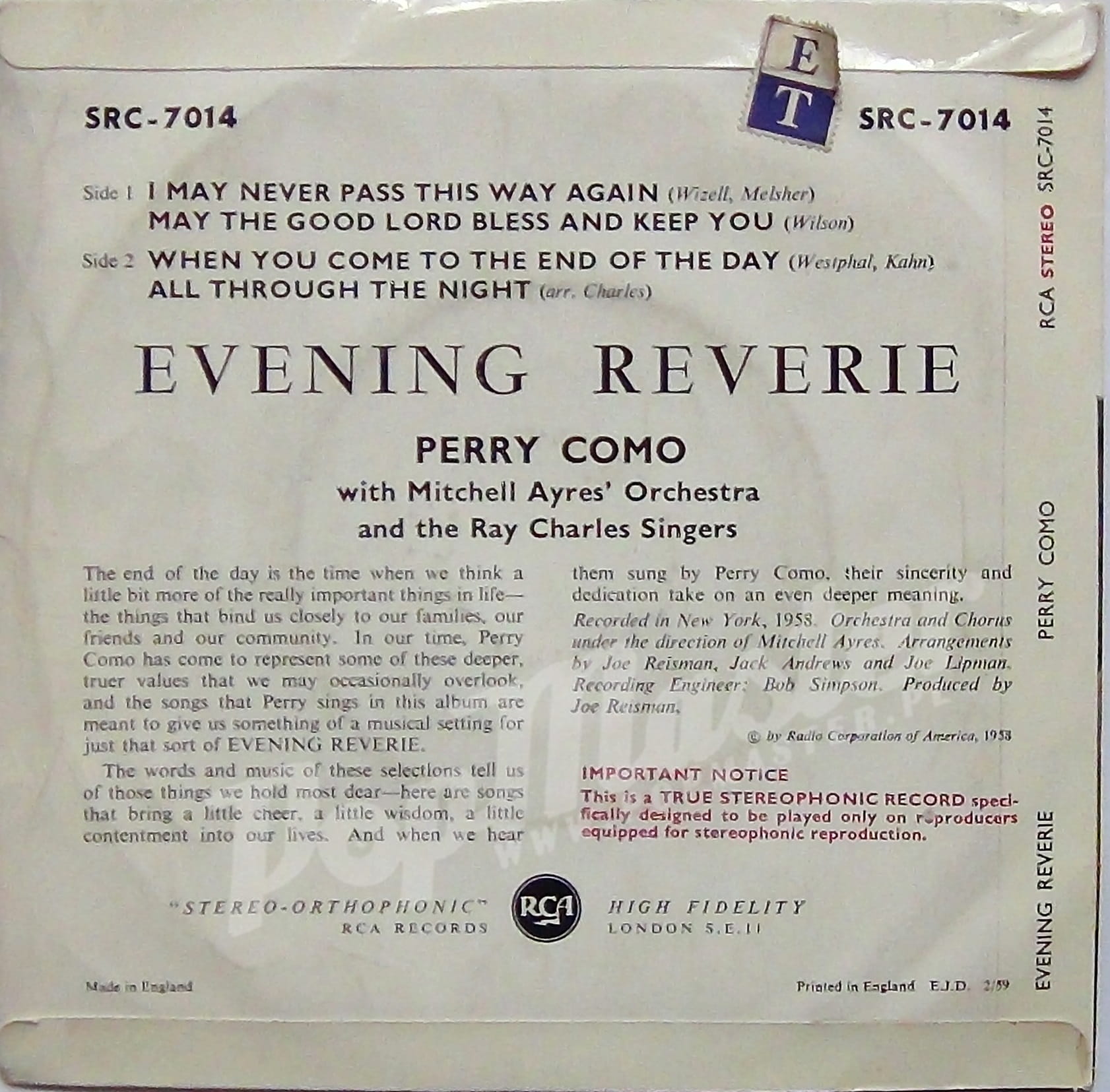 Perry Como Evening Reverie 45 EP SRC-7014 Living Stereo Flipback