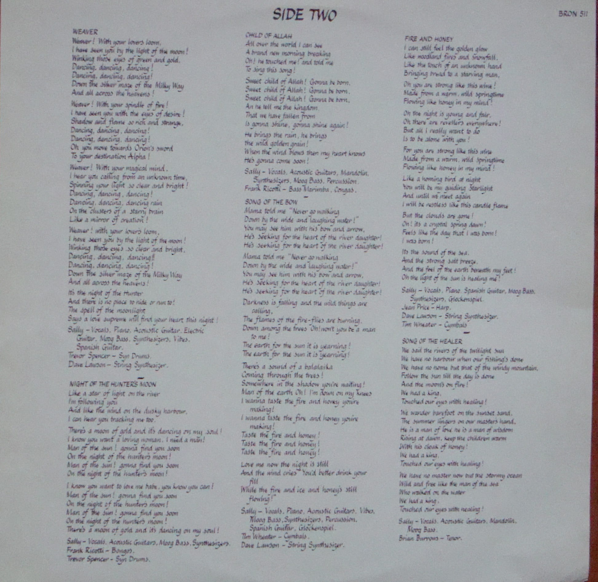 Side One 1 Water Bearer 2 Songs Of The Quendi: Night Theme 3 Songs Of The Quendi: Wampum Song 4 Songs Of The Quendi: Nenya 5 Songs Of The Quendi: Land Of The Sun Side Two 1 Weaver 2 Night Of The Hunter's Moon 3 Child Of Allah 4 Song Of The Bow 5 Fire And Honey 6 Song Of The Healer