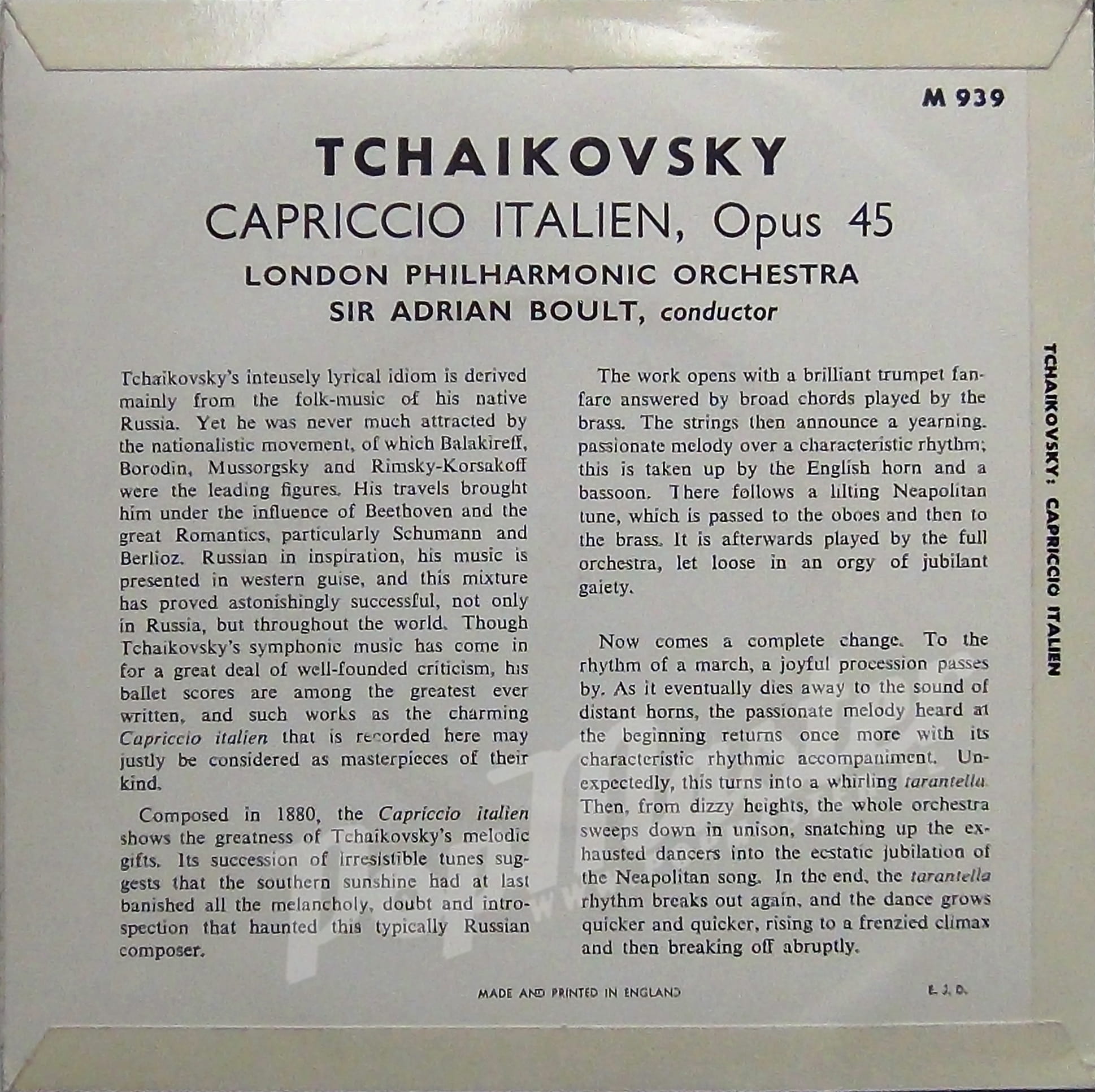 Tchaikovsky Capriccio Italien Op. 45 London Philharmonic Orchestra Sir Adrian Boult M939
