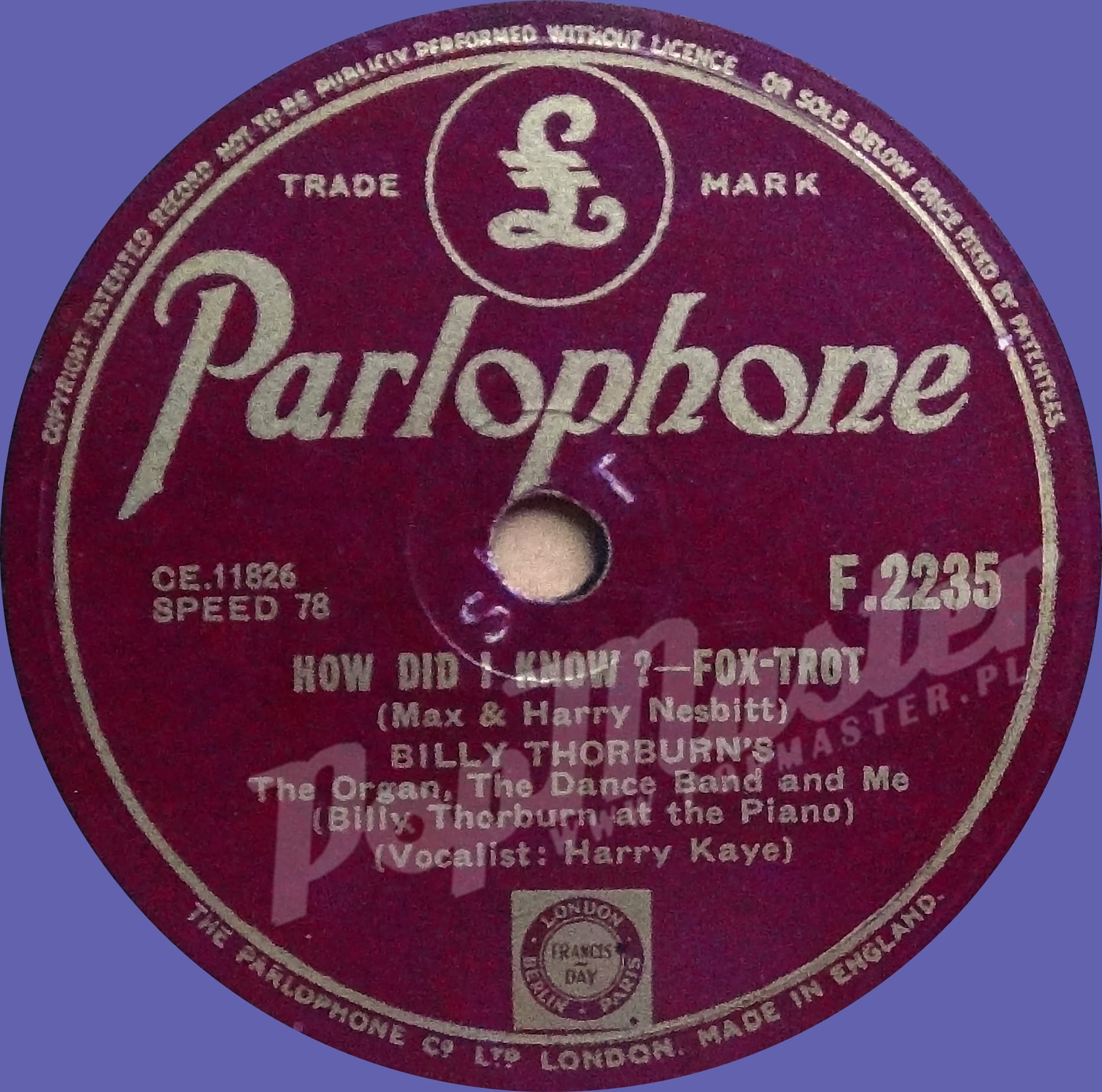 Billy Thorburn's The Organ, The Dance Band And Me How Did You Know ? F2235 78 RPM SHELLAC