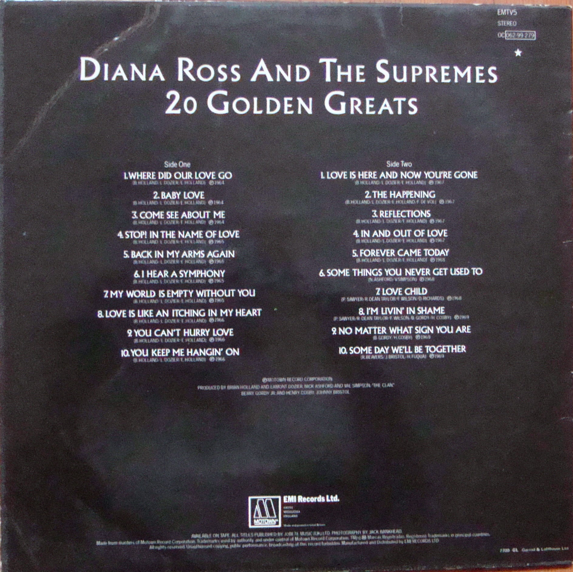 Side One 1 Where Did Our Love Go 2 Baby Love 3 Come See About Me 4 Stop! In The Name Of Love 5 Back In My Arms Again 6 I Hear A Symphony 7 My World Is Empty Without You 8 Love Is Like An Itching In My Heart 9 You Can't Hurry Love 10 You Keep Me Hangin' On Side Two 1 Love Is Here And Now You're Gone 2 The Happening 3 Reflections 4 In And Out Of Love 5 Forever Came Today 6 Some Things You Never Get Used To 7 Love Child 8 I'm Livin' In Shame 9 No Matter What Sign You Are 10 Some Day We'll Be Together