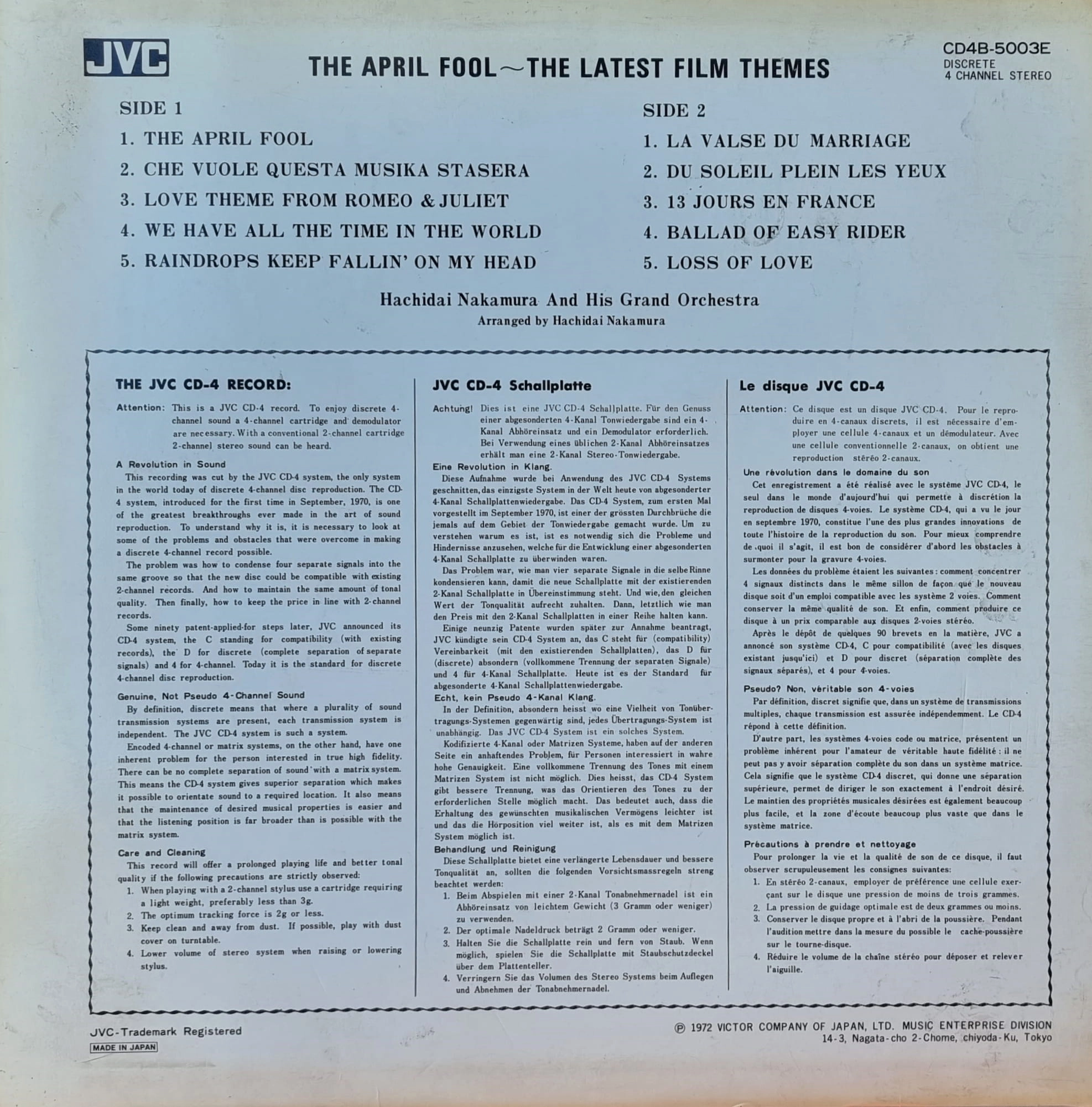 Hachidai Nakamura Grand Orchestra – 幸せなパリで = The April Fool - The Latest Film Themes JVC – CD4B-5003E Quadraphonic