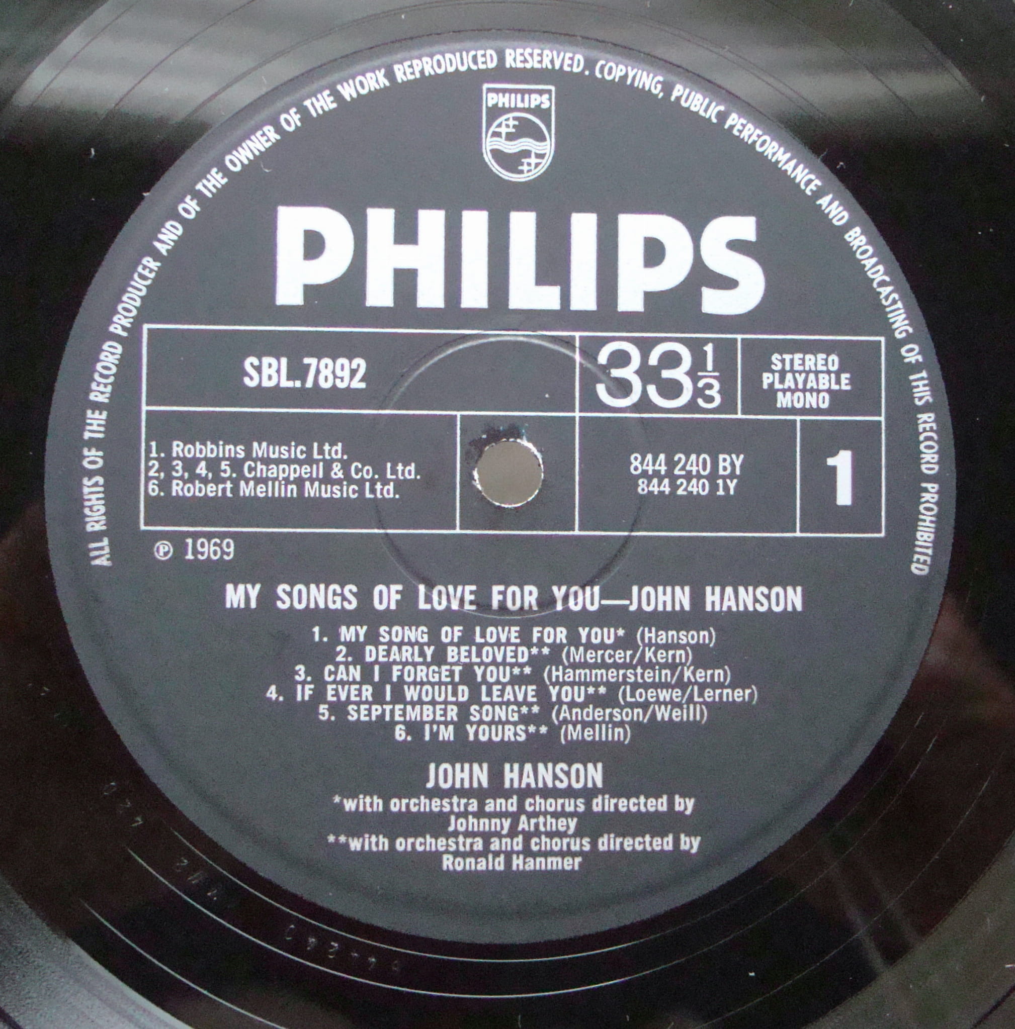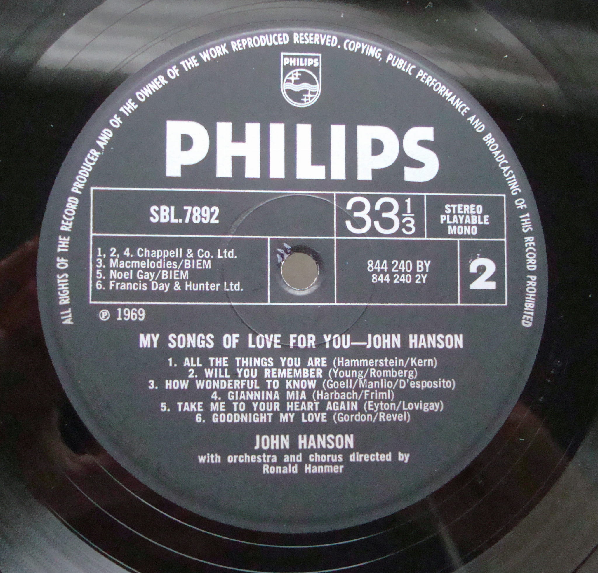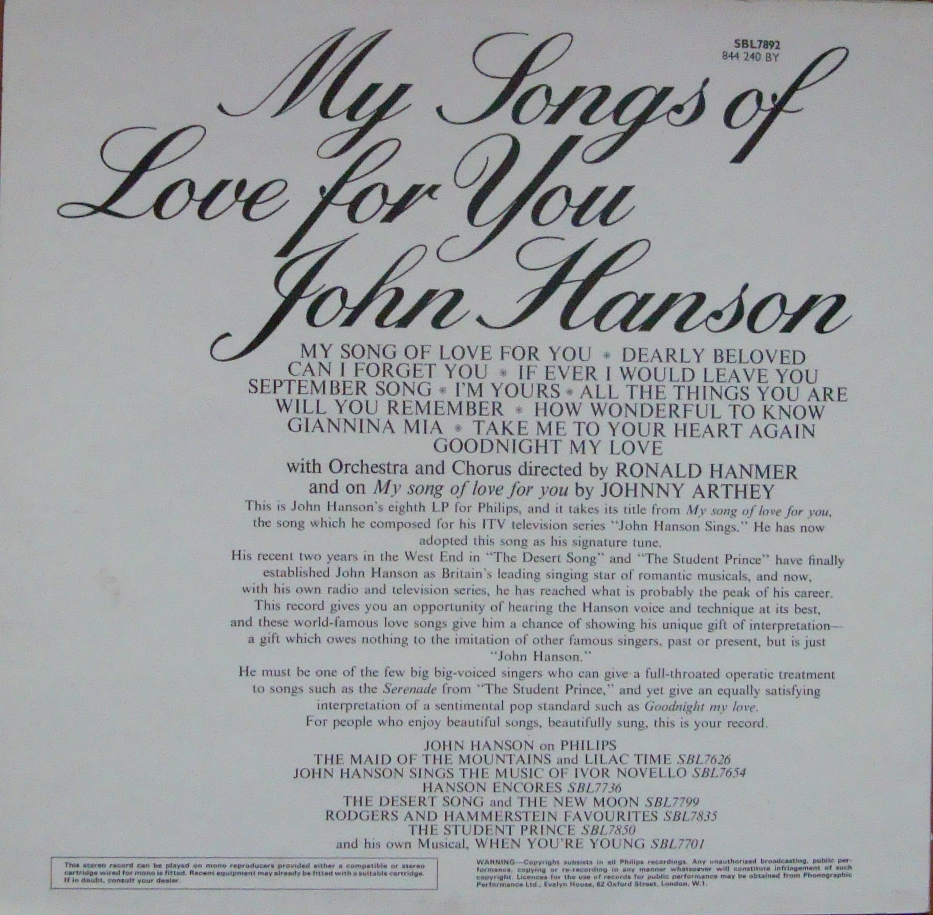 John Hanson - My Songs Of Love For You SBL.7892 Easy Listening Discos de vinilo, disques vinyles, disco de vinil