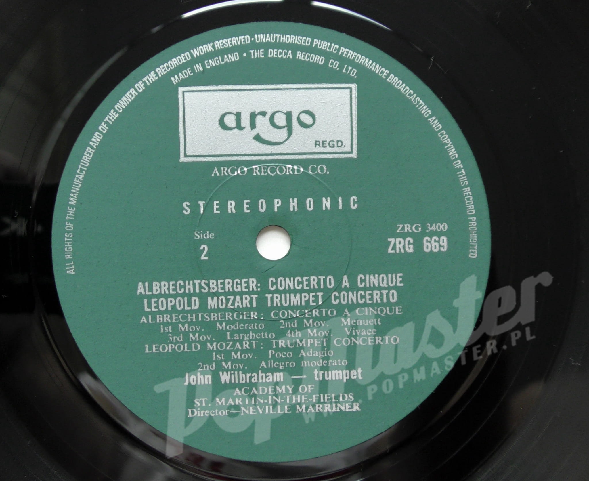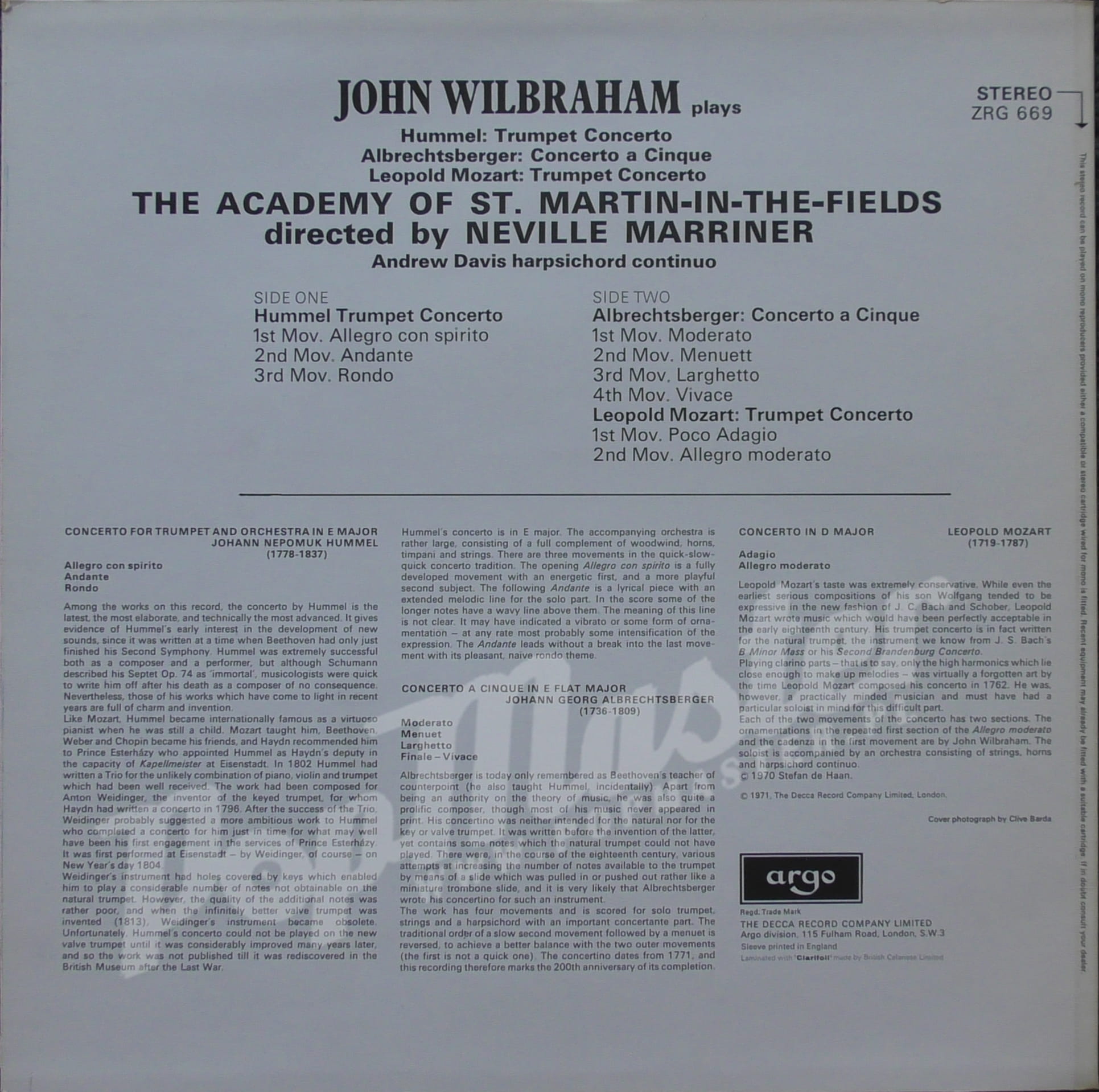 John Wilbraham Hummel, Albrechtsberger, Leopold Mozart Academy Of St. Martin-In-The-Fields Director Neville Marriner Argo ZRG 669 Discos de vinilo, disques vinyles, disco de vinil