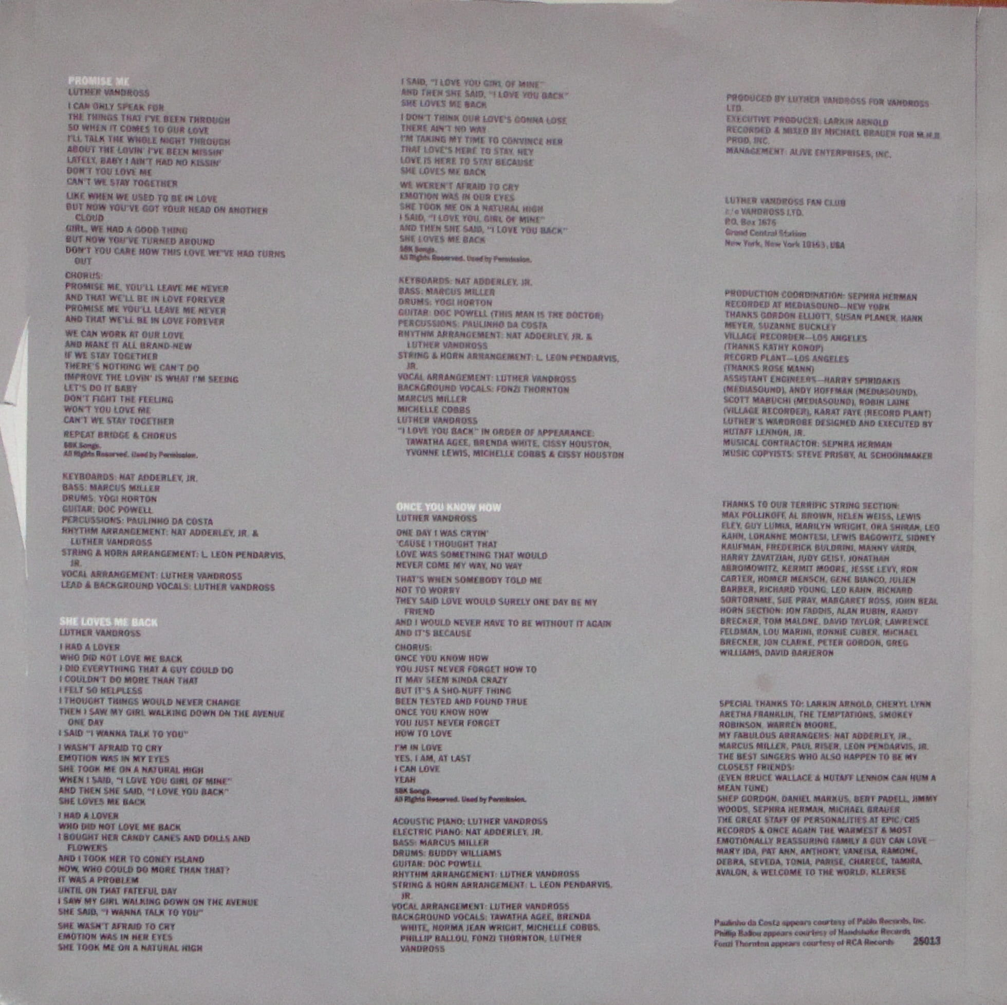 Side One 1 Bad Boy / Having A Party 5:16 2 You're The Sweetest One 4:47 3 Since I Lost My Baby 5:28 4 Forever, For Always, For Love 6:24 Side Two 1 Better Love 6:26 2 Promise Me 4:40 3 She Loves Me Back 6:10 4 Once You Know How 4:36