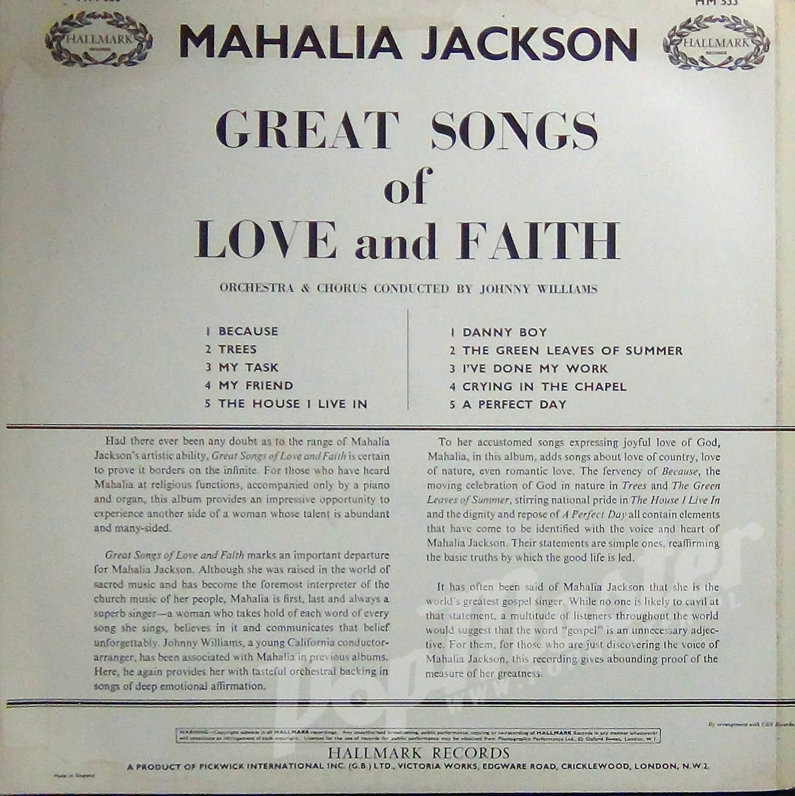 MAHALIA JACKSON GREAT SONGS OF LOVE AND FAITH HM 533