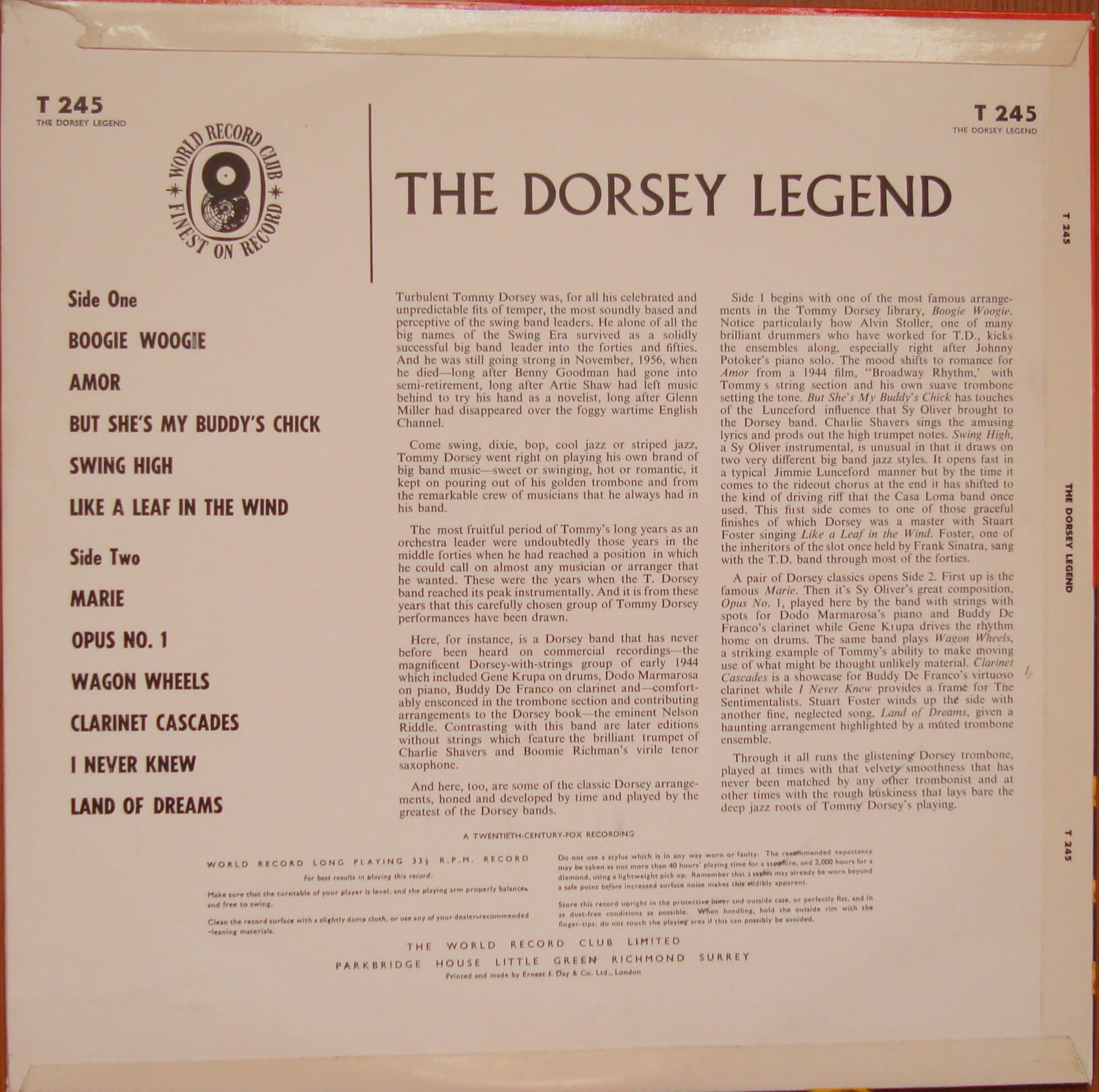 Tommy Dorsey The Dorsey Legend T 245 Jazz , Big Band Winyle