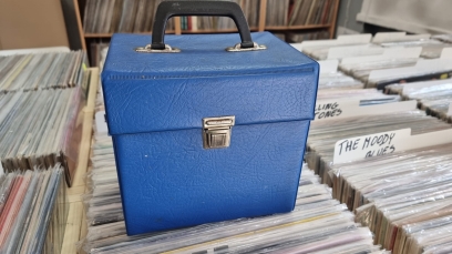 Vintage niebieska walizka na winyle 7 cali na około 50 singli